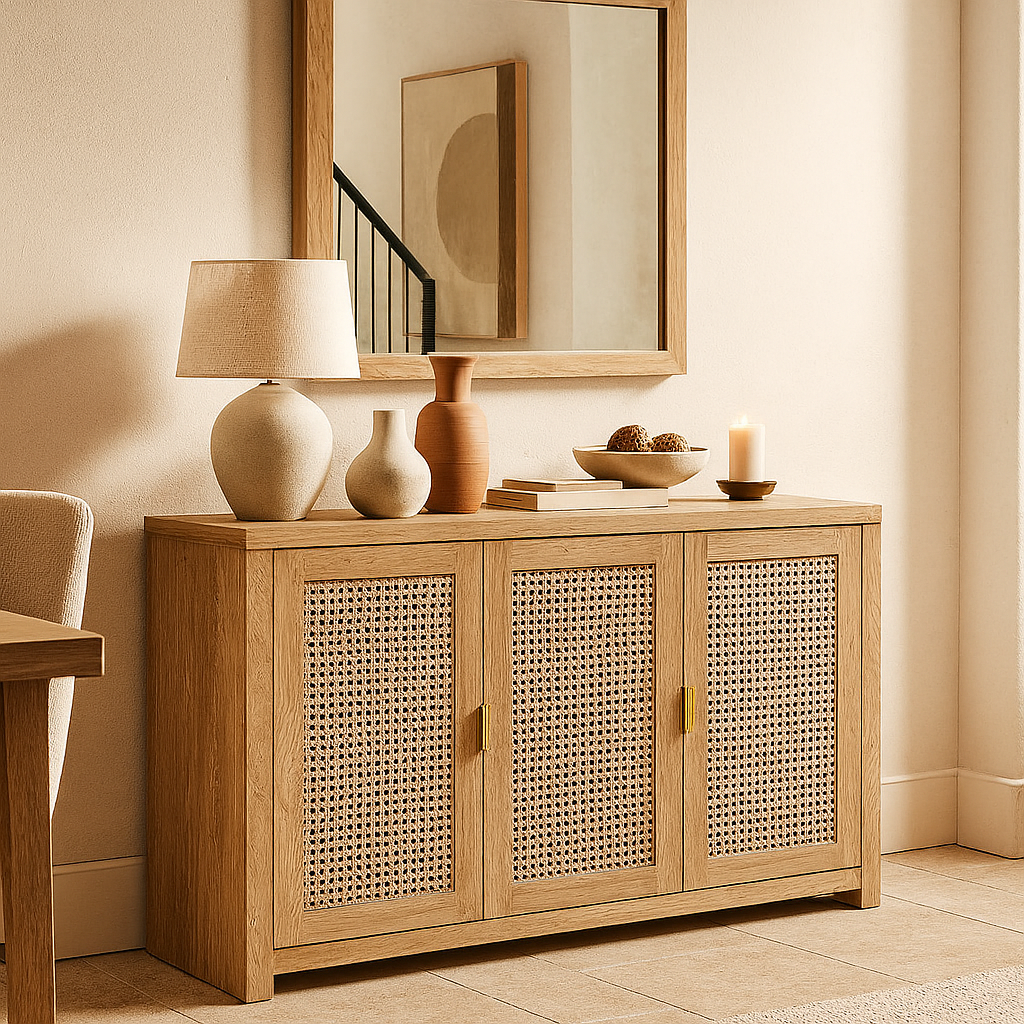 المواد: خشب طبيعي، خيزران/حبال، مقابض معدنية عالية الجودة.