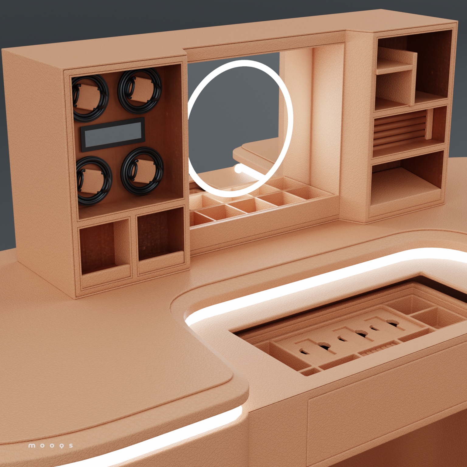 وتتميز الطاولة بتقنية متطورة تضيف لمسة من الحداثة والتميز، حيث يمكن بلمسة بصمة واحدة رفع جزء أنيق من سطح الطاولة ليظهر مرآة فاخرة وستة دوّارات مخصصة للساعات، إلى جانب مساحة مخفية وآمنة لحفظ المجوهرات الثمينة. تم تصميم هذا القسم الداخلي بعناية ليكون مثاليًا لتخزين الخواتم، والقلائد، والأساور، والساعات، مع الحفاظ عليها منظمة ومحمية.