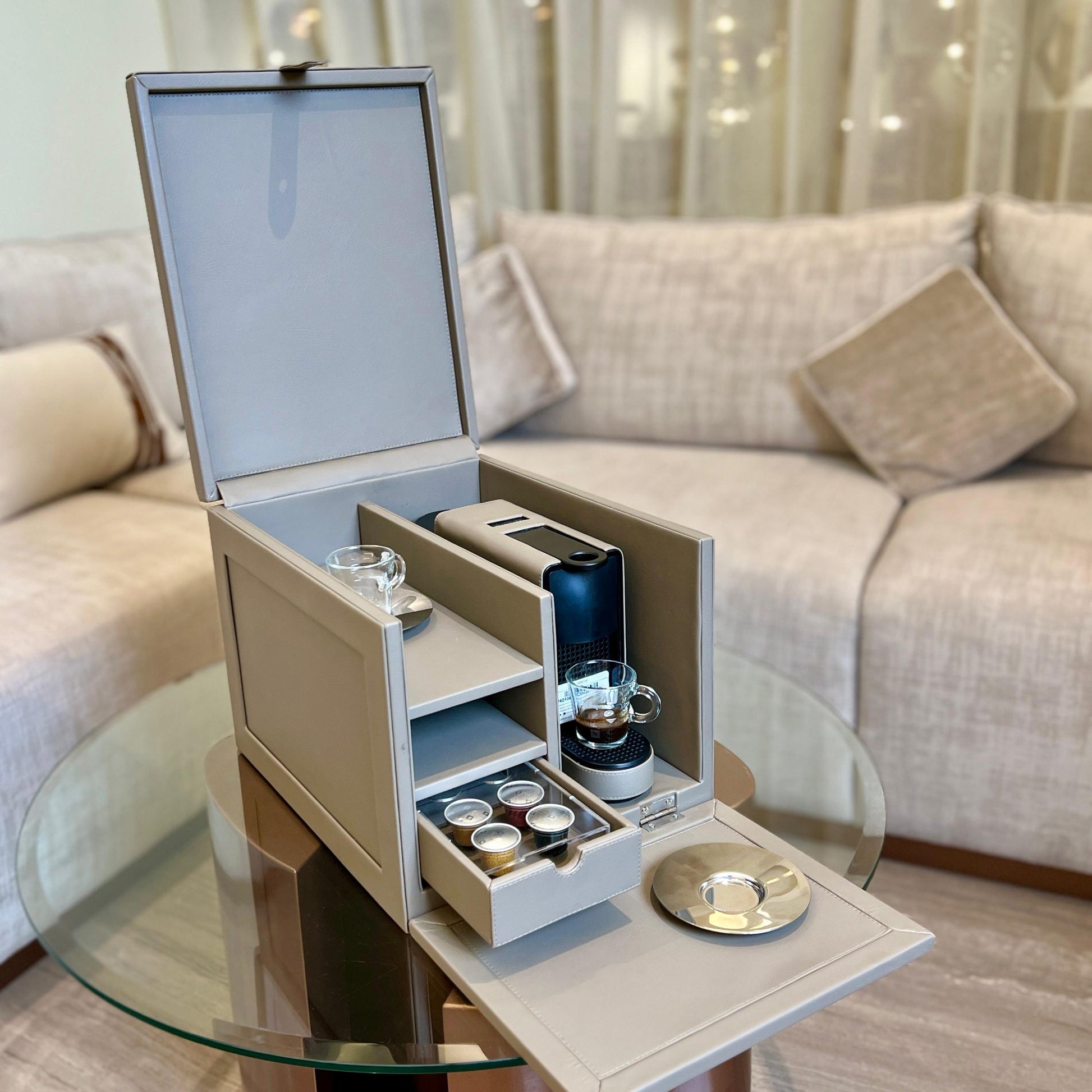 قم بترقية لحظات القهوة الخاصة بك مع آلة الإسبريسو الفاخرة ذات اللون البيج، والتي تم تعبئتها بشكل أنيق في علبة جلدية فاخرة - مثالية للاستخدام الشخصي أو كهدية راقية.